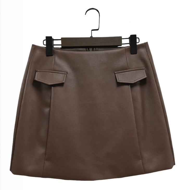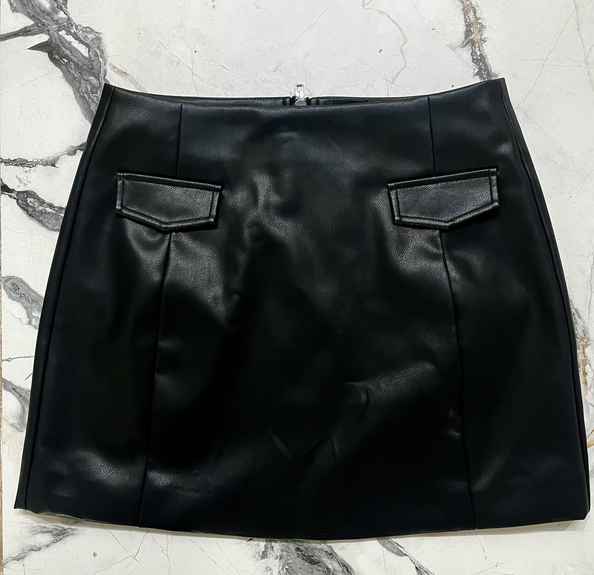 Transform your wardrobe with our Mini Skirt! Featuring an exposed zipper and faux pockets, this vegan leather skirt seamlessly transitions from work to play. Elevate your style and make a statement with this versatile and chic piece!